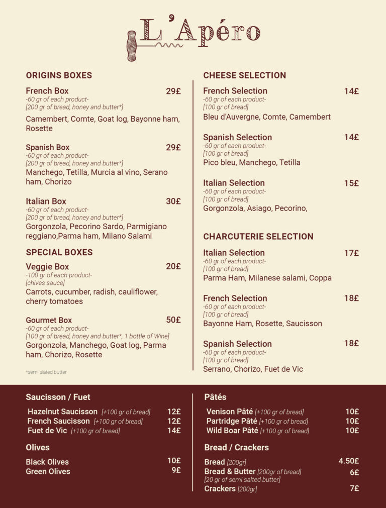 l'apéro. Création de l’identité visuelle et des supports de communication d’une jeune start-up anglo-saxonne. Réalisation de la charte graphique. Mise en page du menu. Création des bannières de devanture de boutique.